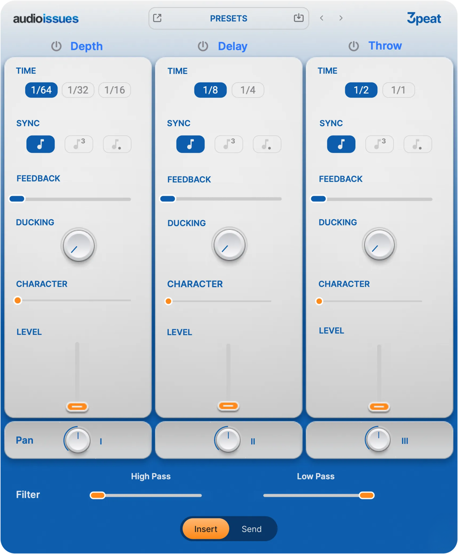 Threepeat helps you create depth, rhythm, and atmosphere with three delay engines built for creativity. Whether you need stereo depth, rhythmic repeats, or lush echoes, Threepeat makes delay fun, fast, and musical again. No convoluted routing. No confusing modulation. Just instant results—whether you’re working on your first demo or your next release.